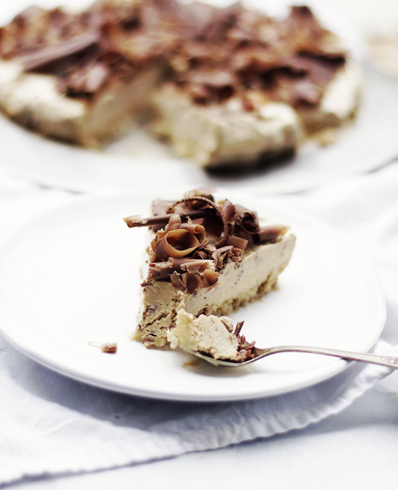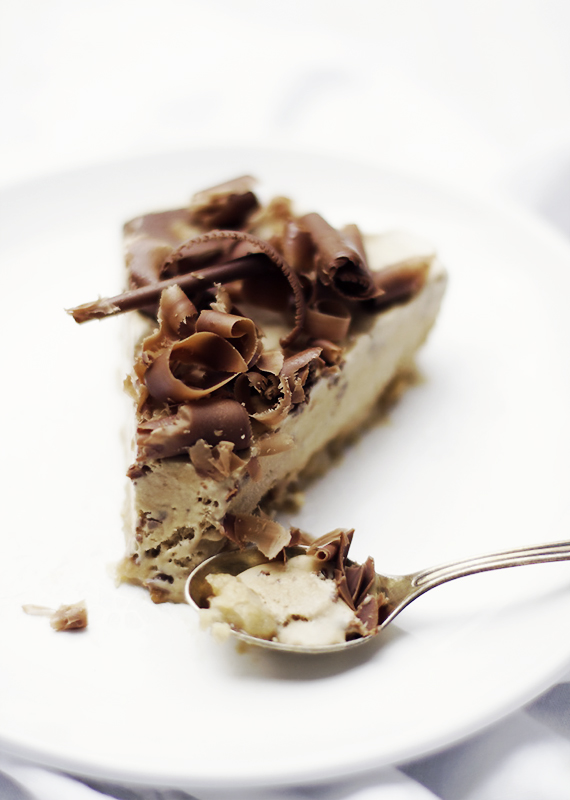 Roztop czekoladę w kąpieli wodnej, a następnie rozsmaruj cienko na gładkiej powierzchni. Kiedy czekolada zastygnie zeskrobuj czekoladowe wióry za pomocą skrobaczki do warzyw lub bardzo ostrego noża. Ja używam szwedzkiego noża do sera, tak zwanego osthyvel. Posyp tort wiórkami i włóż do zamrażalki. Jeśli tort będzie jedzony tego samego dnia zamroź tak aby można go było pokroić. Jeśli tort stoi w zamrażalce dłużej, wyjmij wcześniej przed podaniem.