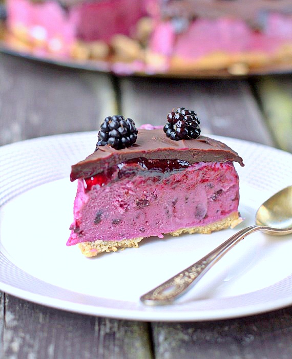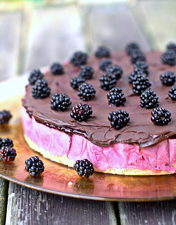 Zagotuj jeżyny z cukrem, odparuj do ½ początkowej objętości i przetrzyj przez sito. Zamarznięty tort posmaruj jeżynowym sosem. Sos po chwili stężeje. Następnie przygotuj ganaché i rozprowadź równomiernie po powierzchni tortu. Przed podaniem przełóż tort do lodówki na godzinę. Udekoruj świeżymi jeżynami i pokrój na kawałki.