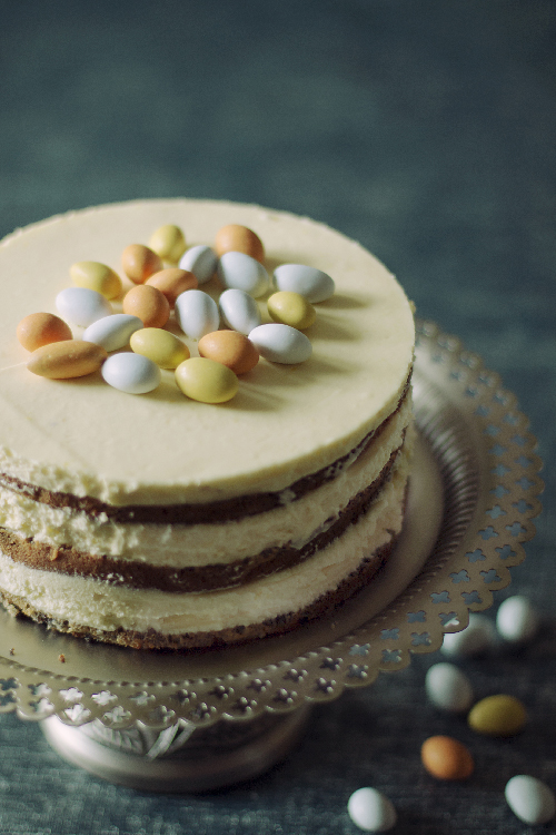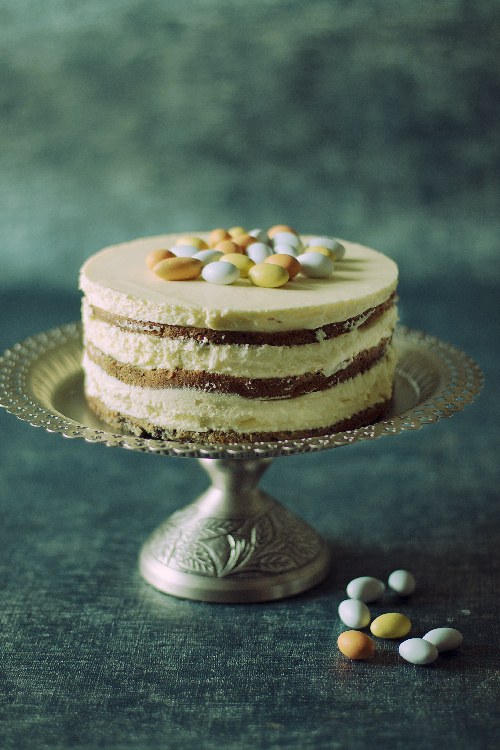 Składniki na krem powinny być dobrze schłodzone. Zacznij ubijać śmietankę. Kiedy już śmietanka zacznie gęstnieć dodaj mascarpone i cukier puder. Na koniec dodaj mascarpone i zmiksuj szybko na gładki krem. Przełóż placki biszkoptowe kremem, zostawiłam odkryte boki, ale kremu wystarczy z powodzeniem na posmarowanie całego tortu. Użyj regulowanej, metalowej obręczy do przełożenia tortu, wygładź powierzchnię i tak włóż do lodówki. Zdejmij obręcz ze schłodzonego tortu i udekoruj tort kolorowymi jajeczkami.