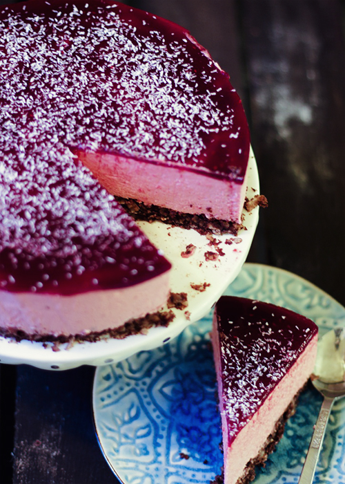 Przygotuj galaretkę na wierzch tortu. Namocz 2 listki żelatyny w wodzie. Zagotuj maliny z cukrem i przetrzyj przez sito. Dodaj odciśniętą żelatynę i mieszaj do rozpuszczenia. Rozsmaruj lekko przestudzoną galaretkę na torcie. Całość posyp kokosowymi wiórkami. Wstaw do lodówki do ścięcia galaretki.