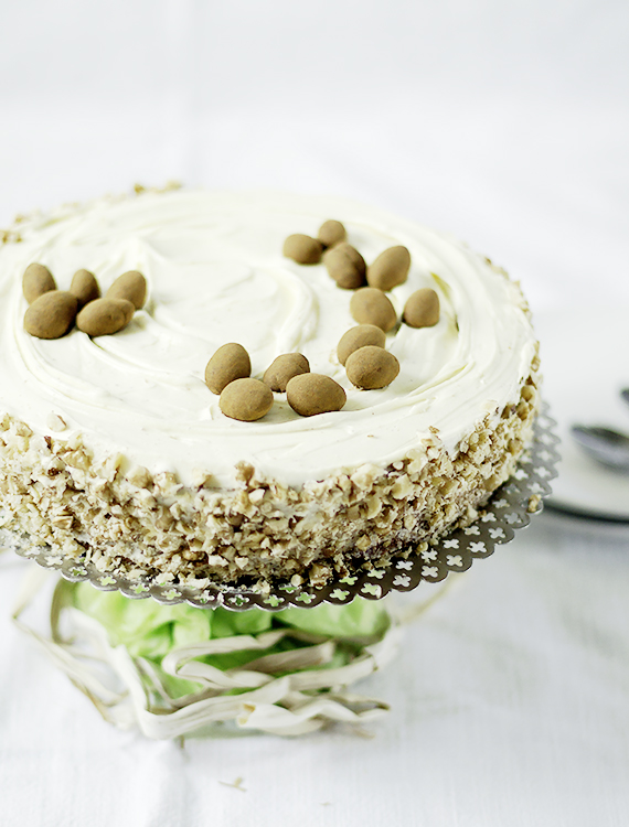 Przygotowując krem, pamiętaj aby wszystkie składniki miały pokojową temperaturę. Rozpuść czekoladę w kąpieli wodnej i ostudź. Zmiksuj masło z cukrem, po czym dodaj serek i zmiksuj jeszcze raz. Na koniec dodaj dokładnie ostudzoną czekoladę i zmiksuj jeszcze raz. Przekrój ciasto na dwa placki. Połóż pierwszy placek paterze. Dostosuj metalową obręcz do średnicy placka, jeśli takiej używasz (ja użyłam). Rozprowadź 2/3 kremu i przykryj drugim plackiem lekko dociskając. Rozsmaruj resztę kremu pozostawiając 3 czubate łyżki. Wstaw tort do lodówki na godzinę. Wyjmij tort po godzinie, zdejmij obręcz i rozsmaruj krem wokół tortu. Udekoruj czekoladowymi jajkami i orzechami.