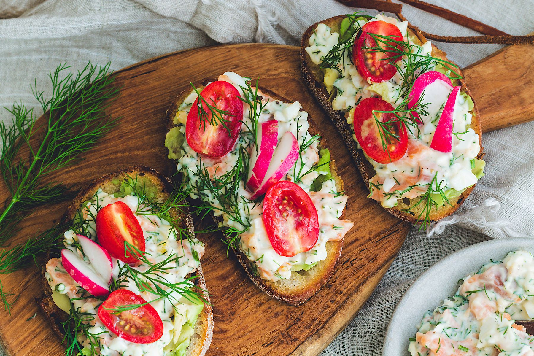- Udekorować tosty połówkami pomidorów, plasterkami rzodkiewek i świeżym koprem. Smacznego!