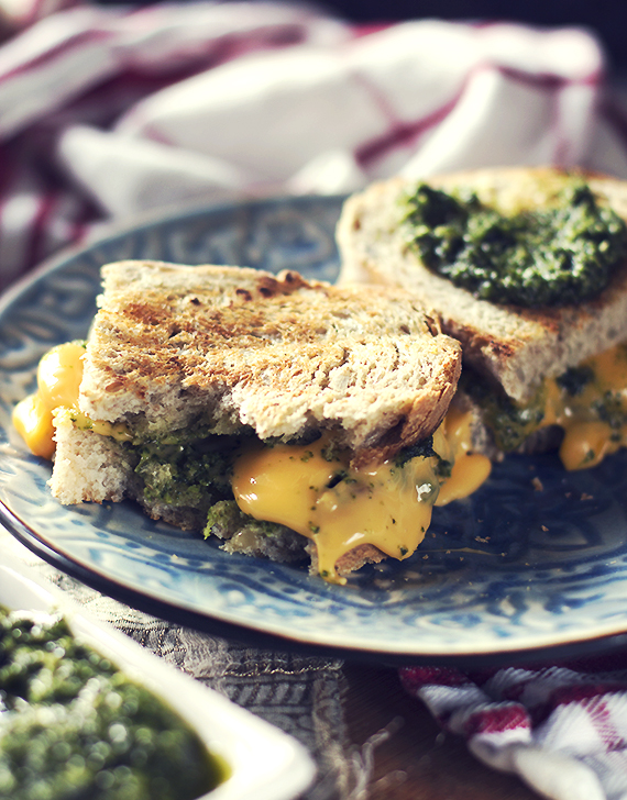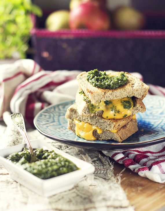 Gorące tosty z jarmużowym pesto i cheddar na śniadanie. Oszalałam na punkcie tego pesto i jadam je prawie codziennie. Dzisiaj wyskrobałam resztki ze słoika i postanowiłam upiec tosty. Wbrew tradycji użyłam chleba na zakwasie ale oczywiście można użyć kromki tostowego chleba. Uwielbiam takie gorące i pożywne śniadania! Jeśli lubicie tosty na słodko to polecam tosty z nutellą.