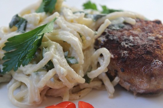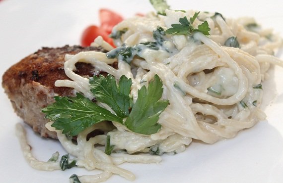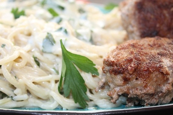 Ostatnio często gotuję sos do makaronu z sera pleśniowego – sos blue cheese. Postanowiłam więc zrobić podobny sos do mielonych kotletów. Do jego przygotowania użyłam spaghetti, ale można z powodzeniem zastąpić je dowolnym makaronem. W sosie nie zabrakło również obfitej ilości grubo pokrojonej natki pietruszki oraz czosnku, który idealnie komponuje się z serem pleśniowym.