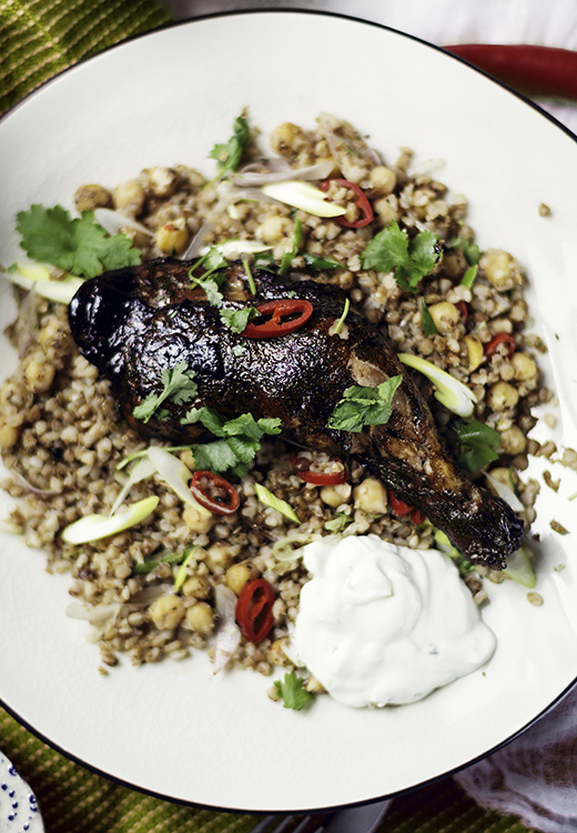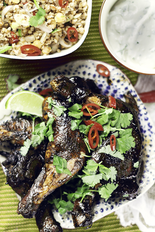 Udka z kurczaka opłucz i osusz papierowym ręcznikiem. Wymieszaj wszystkie składniki na marynatę w pojemnej misie. Dodaj mięso. Wymieszaj tak aby całe mięso było pokryte marynata. Przykryj szczelnie folią i odstaw na 2 godziny lub na noc do lodowki. Nastaw piekarnik na 200ºC. Ułóż mięso na blasze. Zachowaj marynatę do pędzlowania. Piecz kurczaka przez około godziny w zależnosci od wielkości udek. Pedzluj udka resztą marynaty. Podaj z kaszą, ryżem lub sałatką oraz z jogurtem doprawionym świeżą kolendrą, miodem i sokiem z limonki.