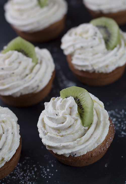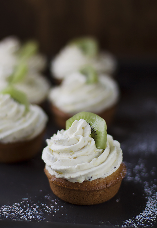 Cztery kiwi pokrój w kostkę i podsmaż na patelni z dwoma łyżkami cukru. Zmiksuj i ostudź. Ubij śmietaną na sztywno i wymieszaj z kiwi. Napełnij szprycę kremem z końcówką w kształcie gwiazdki i udekoruj babeczki. W każdą babeczkę wciśnij plasterek kiwi. Na końcu oprósz cukrem pudrem.