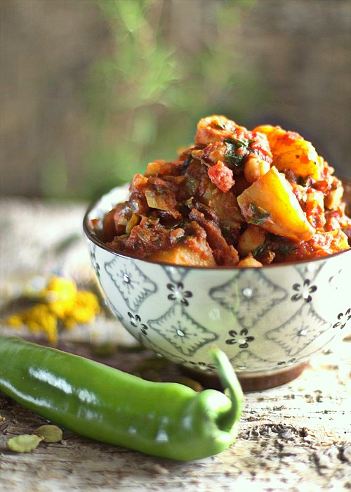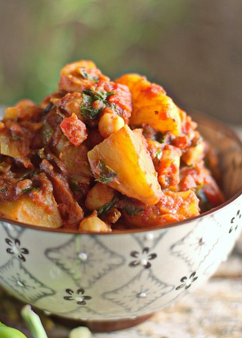 Nasiona przypraw upraż na suchej patelni i zgnieć w moździerzu. Rozgrzej olej, wrzuć pokrojoną w kostkę cebulę, czosnek, imbir, chili, i przyprawy. Smaż przez chwilę po czym dodaj ziemniaki. Jeśli używasz młodych ziemniaków, wybierz te najmniejsze i nie obieraj ze skórki. Ja użyłam młodych ziemniaków ale były dosyć duże, więc je pokroiłam. Smaż ziemniaki, mieszając od czasu do czasu, aby równomiernie się zrumieniły. Kiedy już ziemniaki będą prawie miękkie dodaj ciecierzycę, świeżą kolendrę, zmielone migdały i pomidory. Gotuj curry aż ziemniaki będą miękkie. Podawaj na gorąco jako samodzielne główne danie lub jako dodatek do grillowanego mięsa.