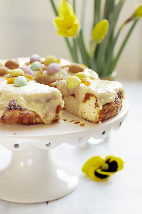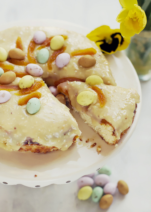 Pokrój morele w kostkę i wrzuć do małego garnka. Zalej wodą, dodaj syrop i gotuj przez 20 minut. Zmiksuj i przełóż do słoika. Dżemu jest więcej niż potrzeba. Ostudzony sernik posmaruj dżemem. W garnuszku umieść połamaną na mniejsze kawałki białą czekoladę. Dodaj śmietankę i syrop. Umieść garnuszek w kąpieli wodnej i mieszaj do rozpuszczenia czekolady. Polej sernik przestudzoną czekoladą i pozostaw do zastygnięcia. Udekoruj sernik kawałkami moreli i jajeczkami.