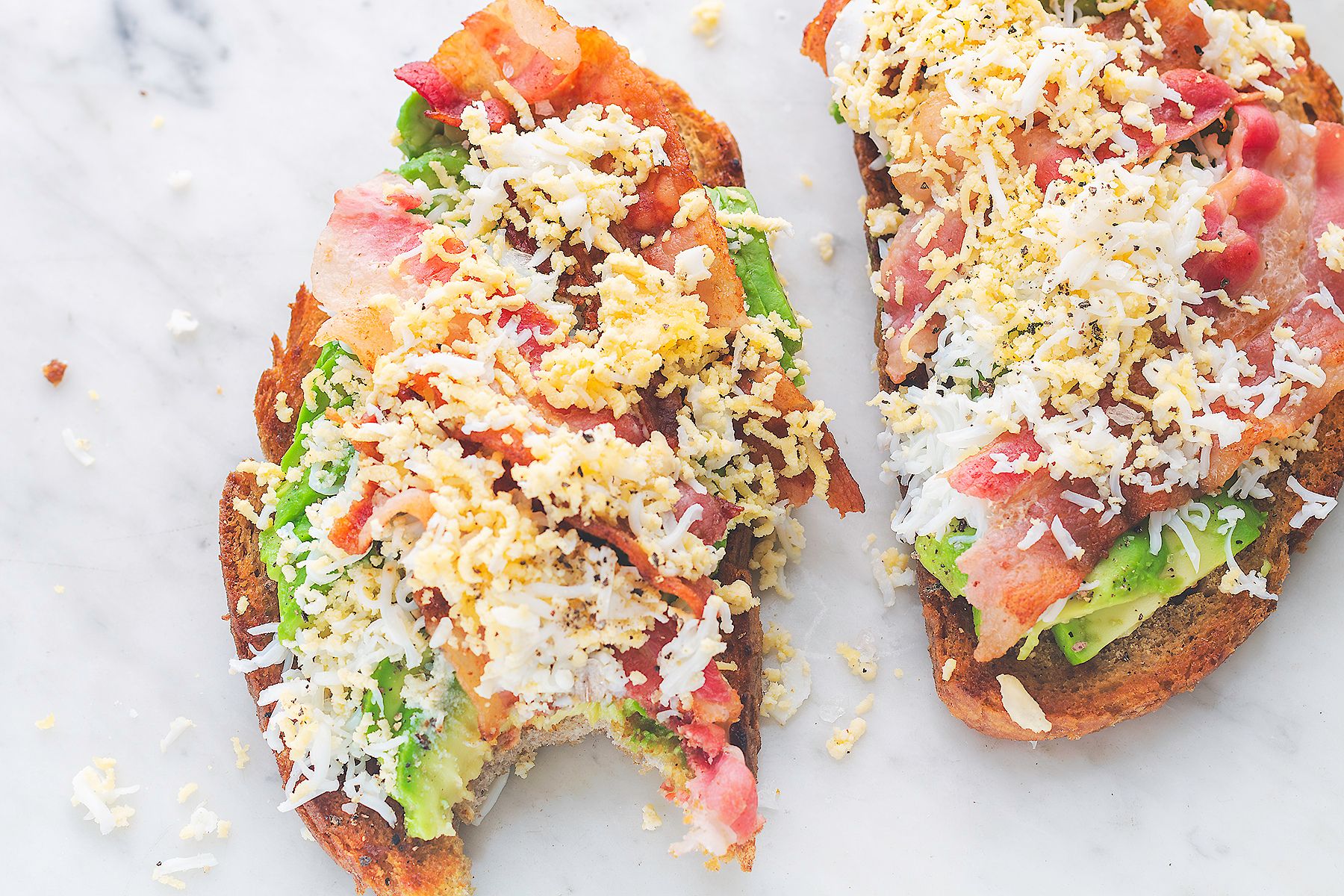 - Na podpieczony tost ułożyć plasterki awokado i oprószyć solą oraz pieprzem. Połowę jajka zetrzeć na tarce bezpośrednio na awokado.