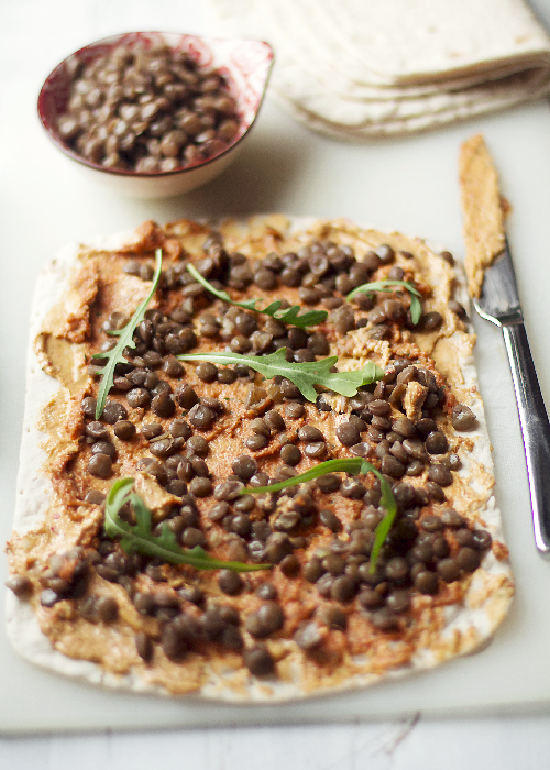 Przypominam o przepisie miesiąca. W marcu gotujemy z fasolą, grochem, soczewicą i innymi roślinami strączkowymi. U mnie dzisiaj wraps z zieloną soczewicą i nie tylko! Zrobiłam dwa rodzaje dipów, które znakomicie pasują do soczewicy, a wszystko zapakowałam w mięciutki płaski chlebek, którego tajemnicy pieczenia jeszcze nie posiadłam. To szwedzki chleb zwany polarnym. Cienkie placki można zwijać w rulon. Bardzo fajny chleb na zimne przekąski.