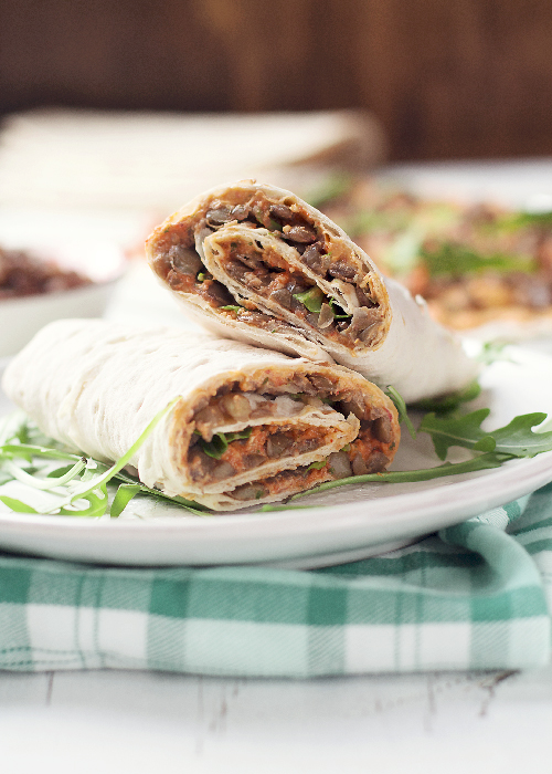 Bardzo lubimy soczewicę, ale standardowe gulasze i pasty nam już się opatrzyły więc tortille ukośnie pokrojone z zieloną rukolą, czerwoną pastą paprykową bardzo ładnie ożywiły nasz jadłospis :-)
