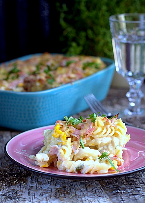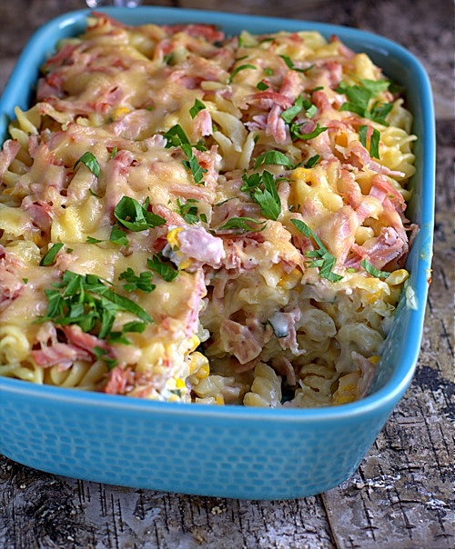 Przepisy na szybkie obiady są bardzo przeze mnie poszukiwane. Dzisiaj kolejny szybki obiad dla zapracowanych, zapiekanka makaronowa z szynką i kukurydzą. Kremowa zapiekanka, którą można skomponować praktycznie z tego co akurat mamy w lodówce. Mój przegląd lodówki był dosyć obfity. Znalazła się skinka, gorgonzola, kremowy żółty ser i resztki kukurydzy. W sam raz na zapiekankę makaronową! Zapiekanka makaronowa z szynką i kukurydzą można przyrządzić wcześniej, a na drugi dzień tylko zapiec.