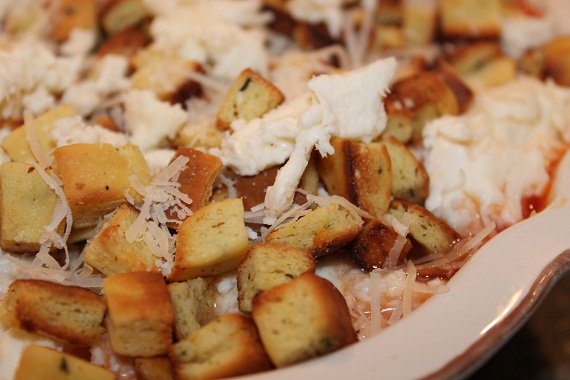 - Nastepnie posyp zapiekanke grzankami, a na koncu reszta parmesanu i mozzarella.