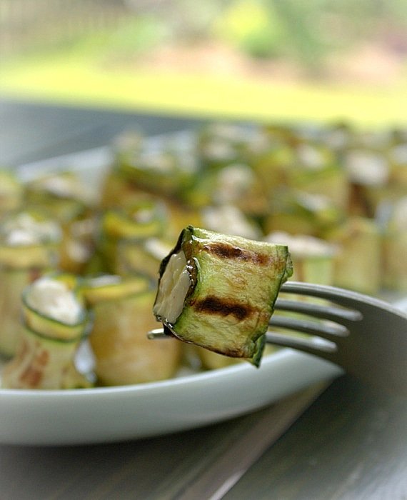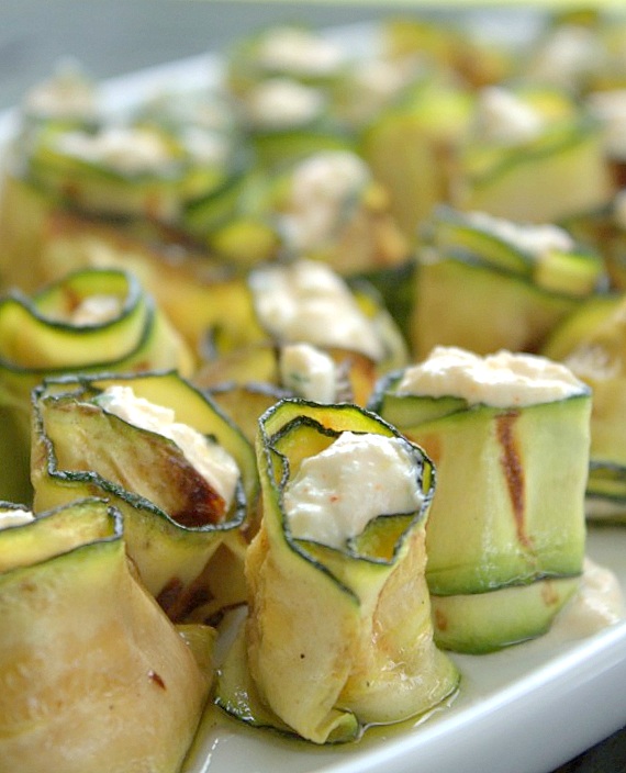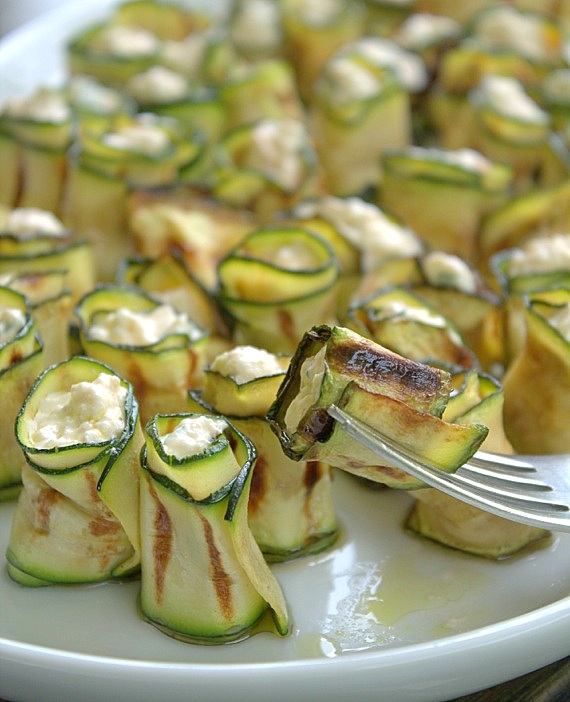 Zimna przekąska z grillowanej cukinii świetnie pasuje na bufetowe party. W cienkie plastry ugrillowanej cukinii zakręciłam nadzienie z koziego sera.
