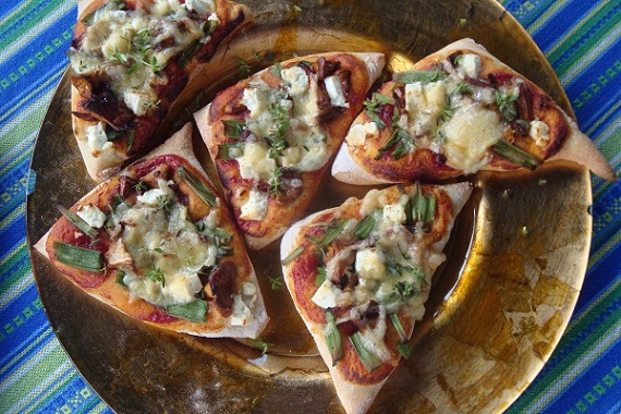 - Posmaruj trójkątne kawałki ciasta sosem do pizzy i warstwami poukładaj kurki, dymkę, pokruszony kozi ser, a na wierzchu posyp tartym serem.