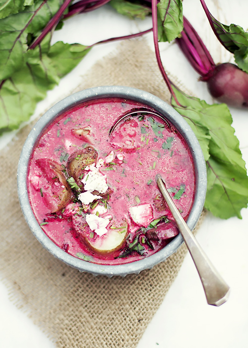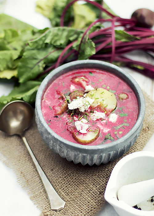 Zupa botwinkowa z młodymi ziemniakami i fetą to ulubiona letnia zupa. Wiele wspomnień z dzieciństwa kojarzy mi się z tą zupą. Wakacje na wsi, na które czekałam cały rok. Zawsze lubiłam buszować w babcinym ogrodzie. Kiedy już przyszła pora na obiad, wystarczyło iść do ogródka po świeże warzywa i zioła. Na poddaszu suszyły się domowej roboty kiełbasy i boczki, więc jeśli ktoś miał ochotę na „skwarki” to wystarczyło iść na górę i uciąć kawałek…Bardzo chciałabym wrócić do tych czasów, uprawiać warzywa i hodować zwierzęta na własne potrzeby, ekologicznie i zdrowo. Wierzyć mi się nie chce, że niektóre dzieci nie wiedzą co to jest wiejskie życie. Całe szczęście, że wciąż mam rodzinę na wsi. Dla moich dzieci to wielka frajda, a dla mnie nostalgia i powroty do dzieciństwa.