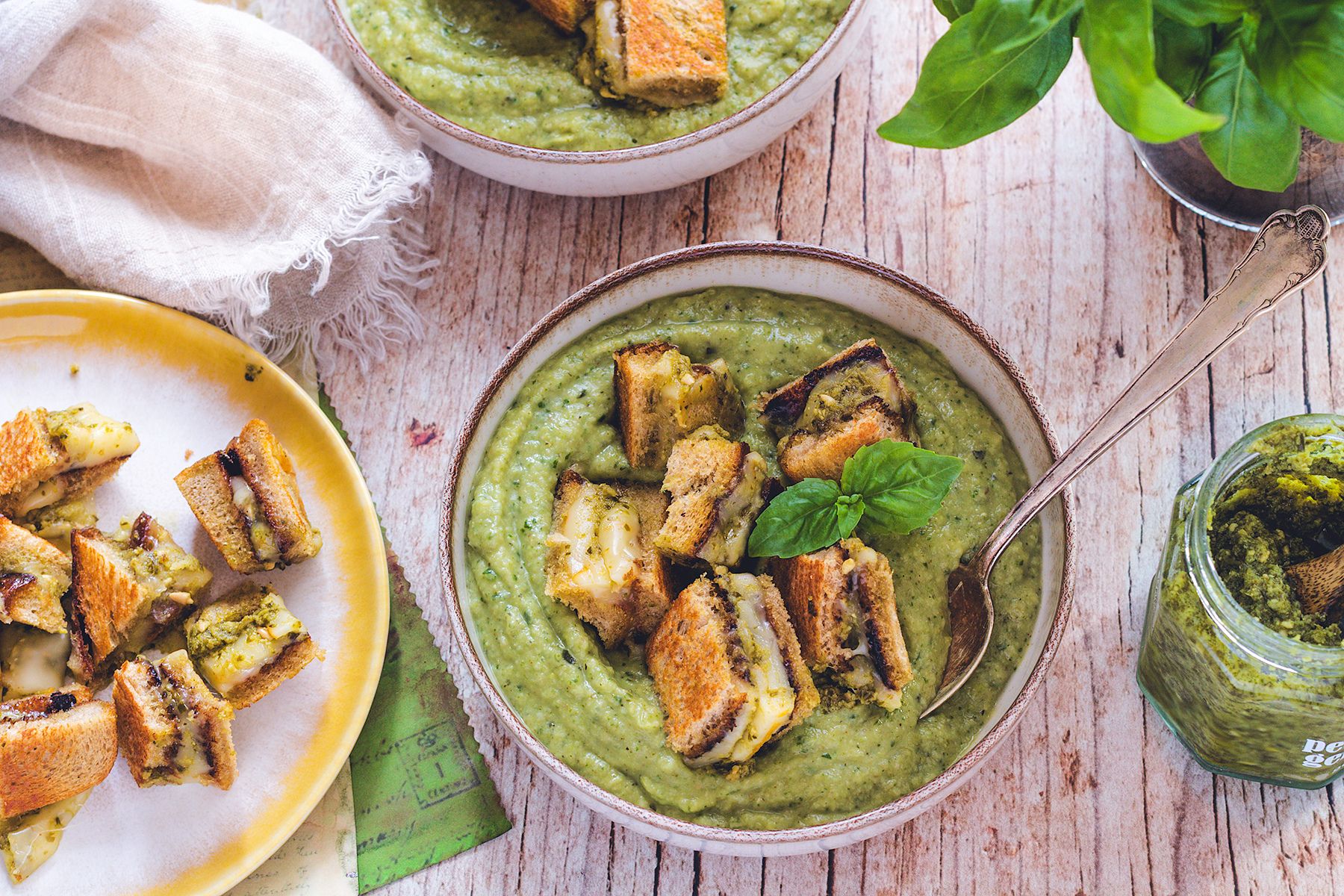 Ale na tym magia się nie kończy. Dobra, pożywna i smaczna zupa krem to taka, która ma pyszne dodatki. Oczywiście można ją posypać prażonymi nasionami, podać z pokruszoną fetą albo chrupiącym halloumi. Tylko powiedzcie sami, czy grzanki z serem i pesto nie brzmią jeszcze lepiej? Bo o ile zielona zupa krem sama w sobie jest całkiem smaczna, to dopiero w duecie z tymi grzankami staje się naprawdę wyjątkowa.