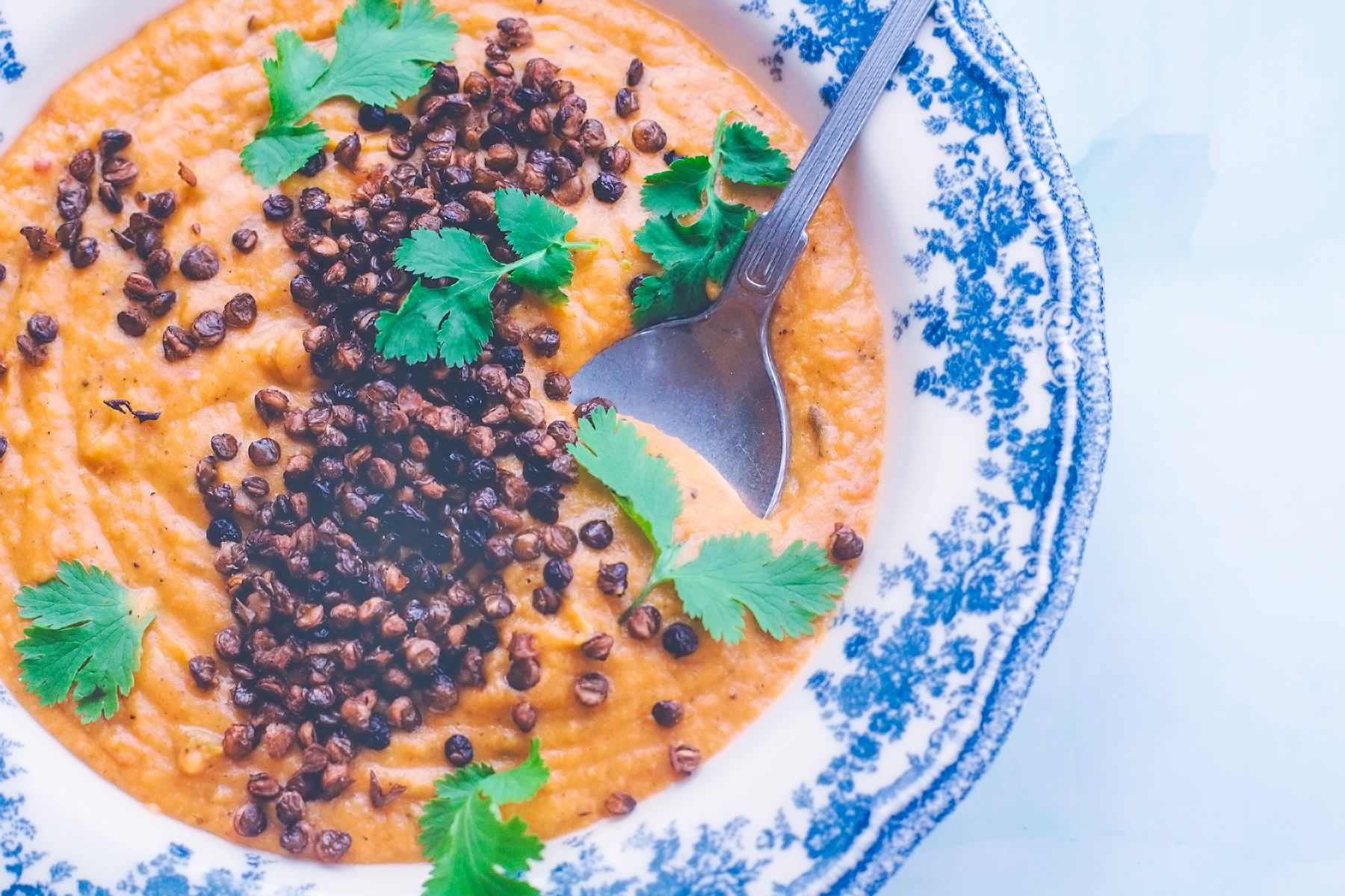- Rozlać zupę na talerze posypać pieczoną soczewicą i udekorować kolendrą. Smacznego!