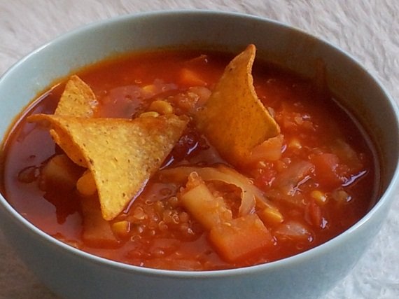 Co prawda to już nie pora na zupy, bynajmniej u nas, gdy lato w pełni, ale chciałam dodać ten przepis do akcji „Hola mexico„,która właśnie się zbliża ku końcowi. Zupa jest bardzo smaczna, ostra nie do przesady, a kukurydziane chipsy działają jak magnes na moje dzieci. Muszę się przyznać, że też je bardzo lubię. Zupa jest dosyć gęsta, więc można sobie moczyć chipsy w zupie i długo się nią delektować.