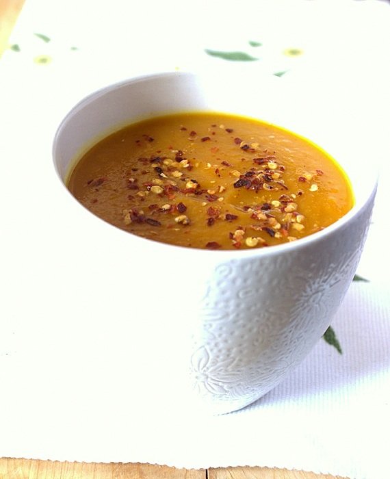 Dzisiejsza zupa z dyni to zupa wegetariańska ugotowana na warzywnym bulionie. Oczywiście nic trudnego ugotować zupę dyniowa na bulionie z mięsa… Zupa ma lekko wyczuwalny smak jabłka, imbiru i ostrej żółtej curry w proszku. Dla odważnych posypałam zupę rozgniecionymi płatkami wędzonej chili. Oto przepis: