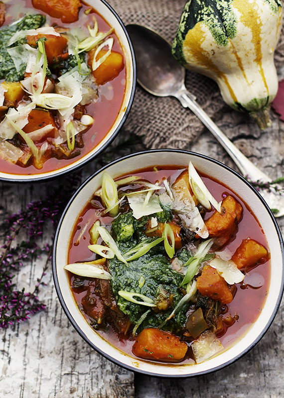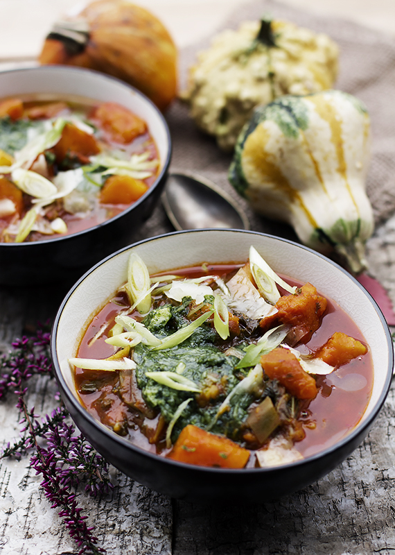 Halloween już tuż, tuż, więc na blogu przepisy z dyni prawie jeden za drugim. Dzisiaj kolejny przepis na zupę z dyni, ale tym razem zupa dyniowa z jarmużem i pistou. Podstawą tego dania jest oczywiście dynia, która świetnie harmonizuje z zielonym jarmużem. Zupa bardzo bardzo pożywna, bogata w witaminy, jedna z moich ulubionych. Lubię zupy z dodatkami, a do dyniowej robię często pistou czyli francuski wariant podobny do pesto ale bez orzechów i nasion.