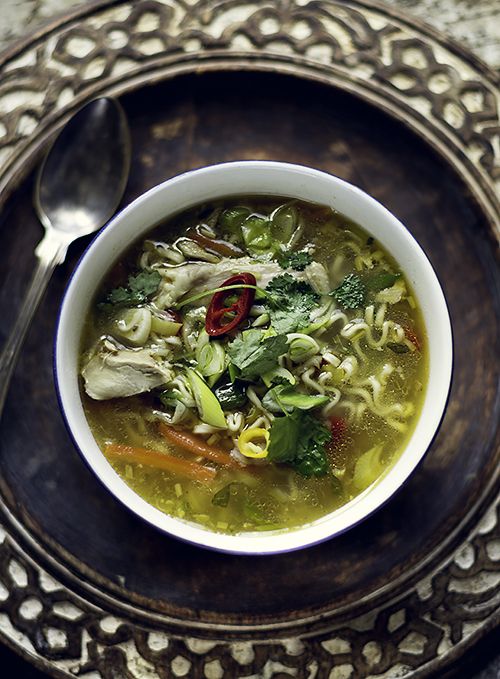 Zupa z kurczakiem i makaronem noodle na ostro, na rozgrzewkę, na szybkie trawienie. Zajadałam się nią przez kilka miseczek. Bardzo lubię zupy, moje dzieci lubią, więc co i rusz wymyślam nowe przepisy na zupy. Przyznaję, że mam moją ulubioną zupę, botwinkę. Zupy gotuję wedle pory roku, a wiadomo botwinka rośnie latem…Zupa na bulionie z kurczaka jest bardzo smaczna. Aby zupa była jeszcze bardziej pożywna dodaję do niej odebrane z kości mięso. Nie może się obyć bez warzyw i zieleniny.