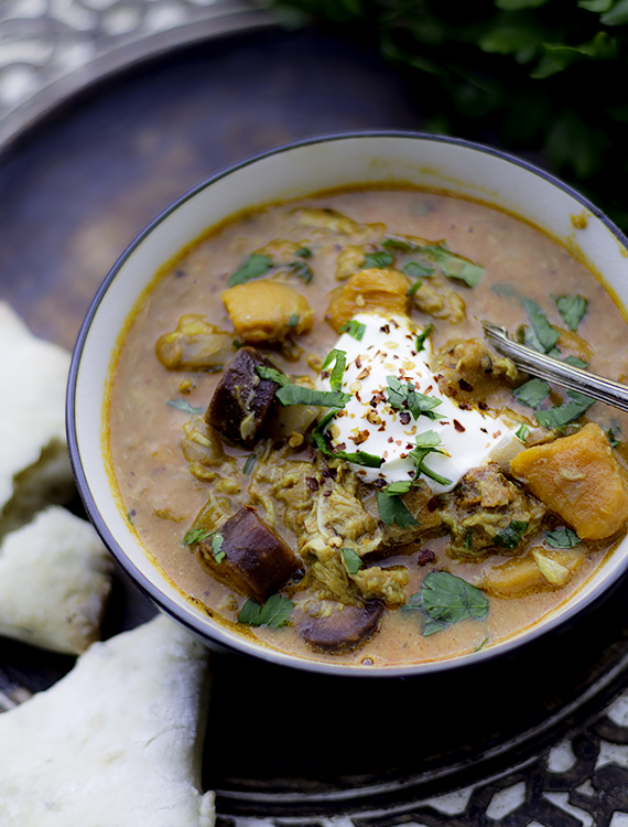 Ugotuj bulion z mięsa. Ostudzone mięso oddziel od kości, pokrój lub porwij na kawałki. Obierz batata, marchewkę, pasternak i pokrój w kostkę. Pokrój cebulę w piórka, a czosnek drobno posiekaj. Drobno posiekaj cytrynową trawę. Cebulę, czosnek i trawę zeszklij na oliwie. Dodaj pokrojone warzywa, pastę curry, kurkumę, pieprz i smaż przez 5 minut. Dodaj bulion i gotuj zupę przez około 20 minut, aż warzywa będą miękkie. Na koniec dodaj mięso kurczaka i posiekaną pietruszkę. Napełnij miseczki gorącą zupą. Podaj zupę z creme fraiche i chlebem.